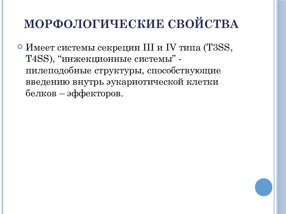 Имеет системы секреции III и IV типа (T3SS, T4SS), “инжекционные системы” - пилеподобные структуры, способствующие введению внутрь эукариотической клетки белков – эффекторов.