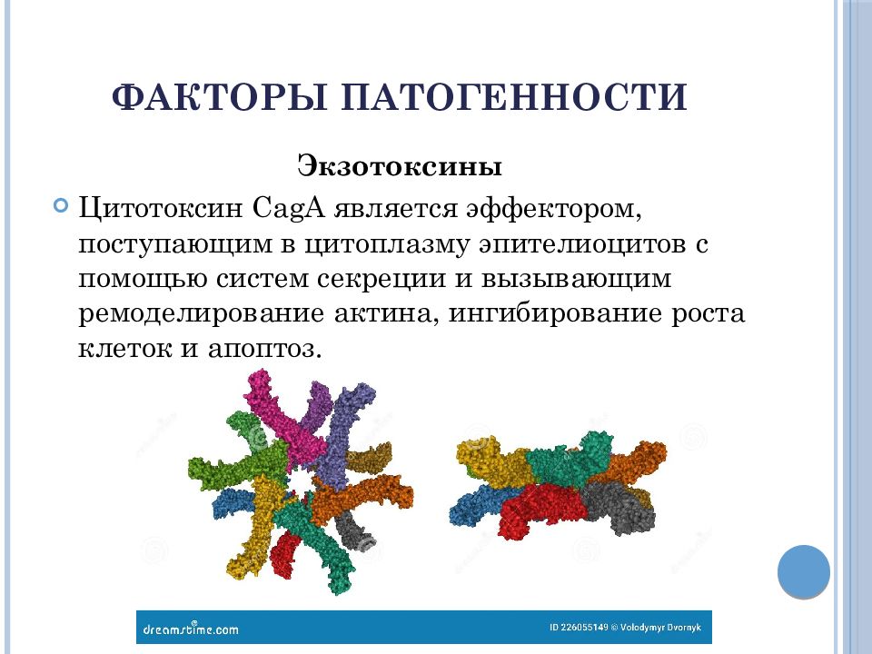 Экзотоксины Цитотоксин CagA является эффектором, поступающим в цитоплазму эпителиоцитов с помощью систем секреции и вызывающим ремоделирование актина, ингибирование роста клеток и апоптоз.