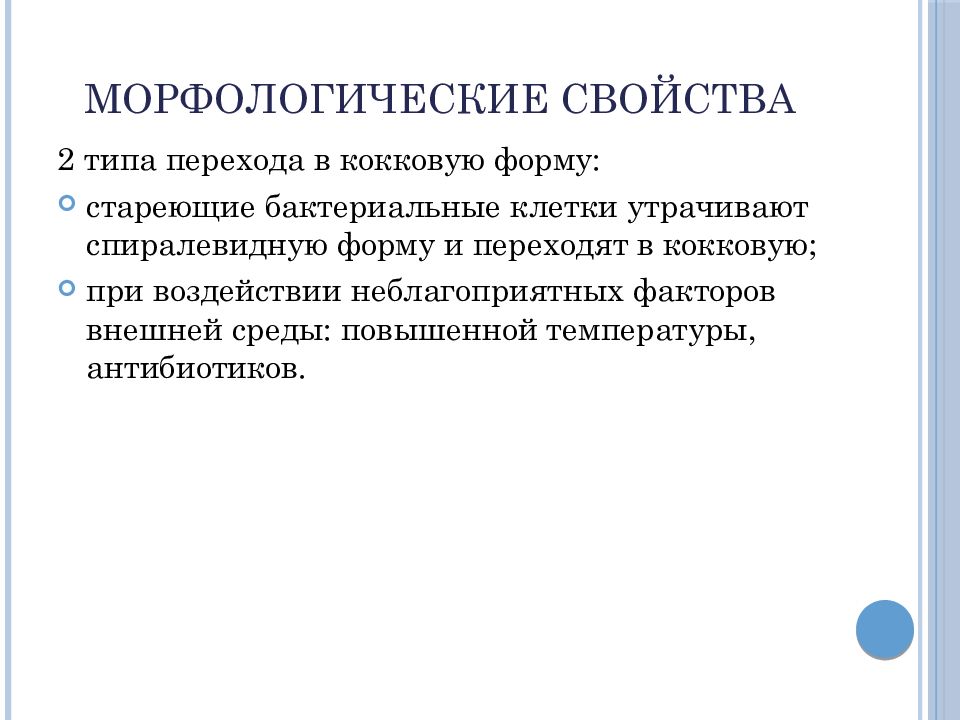 2 типа перехода в кокковую форму: с тареющие бактериальные клетки утрачивают спиралевидную форму и переходят в кокковую; при воздействии неблагоприятных факторов внешней среды: повышенной температуры, антибиотиков.