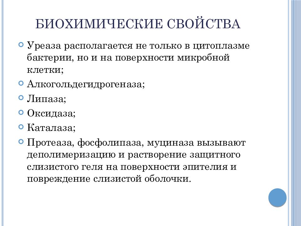 Уреаза располагается не только в цитоплазме бактерии, но и на поверхности микробной клетки; Алкогольдегидрогеназа ; Липаза; Оксидаза; Каталаза; Протеаза, фосфолипаза, муциназа вызывают деполимеризацию и растворение защитного слизистого геля на поверхности эпителия и повреждение слизистой оболочки.