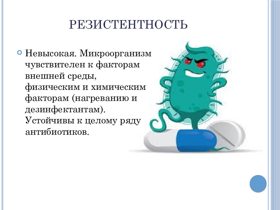 Невысокая. Микроорганизм чувствителен к факторам внешней среды, физическим и химическим факторам (нагреванию и дезинфектантам ). Устойчивы к целому ряду антибиотиков.