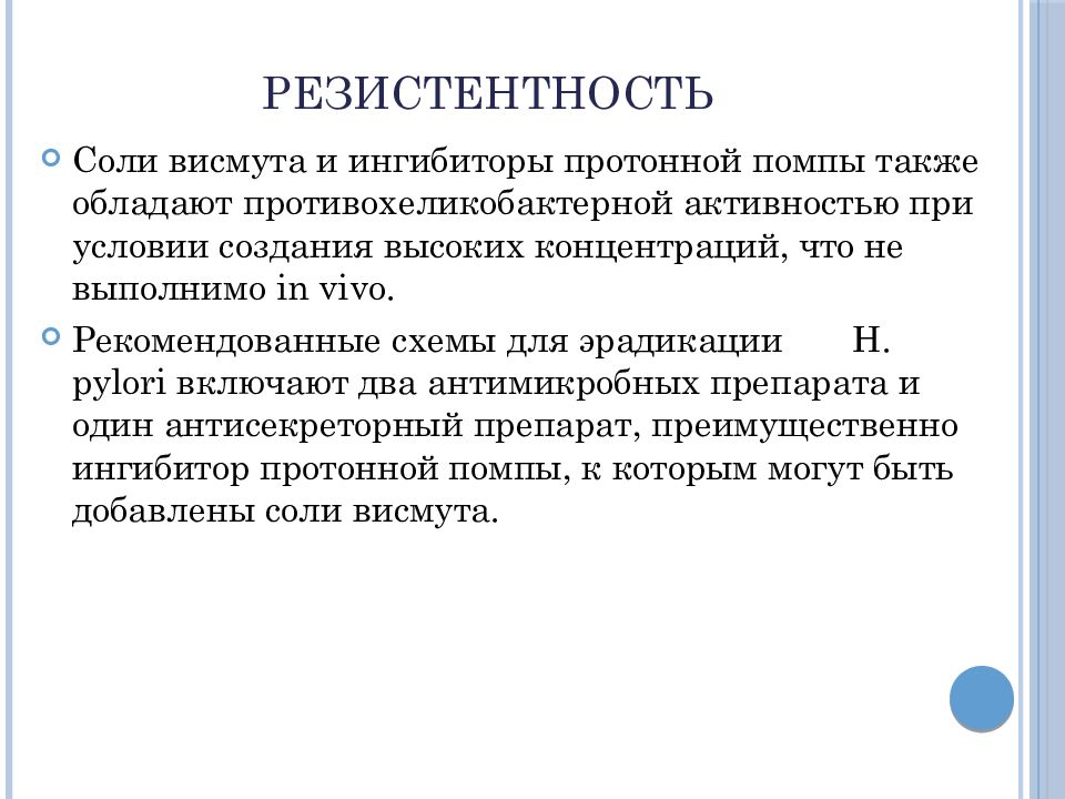 Соли висмута и ингибиторы протонной помпы также обладают противохеликобактерной активностью при условии создания высоких концентраций, что не выполнимо in vivo. Рекомендованные схемы для эрадикации Н. pylori включают два антимикробных препарата и один антисекреторный препарат, преимущественно ингибитор протонной помпы, к которым могут быть добавлены соли висмута.