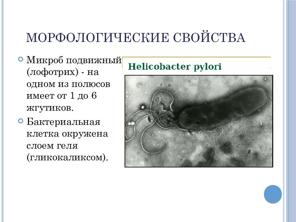 Микроб подвижный ( лофотрих ) - на одном из полюсов имеет от 1 до 6 жгутиков. Бактериальная клетка окружена слоем геля ( гликокаликсом ).