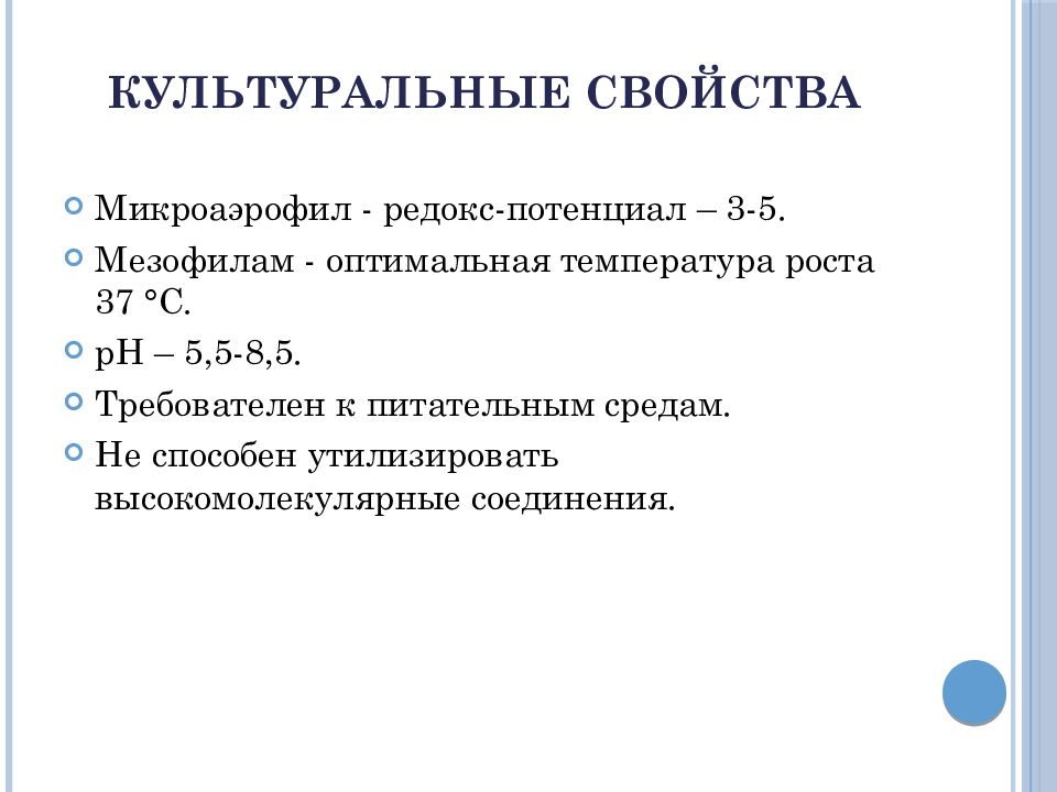 Микроаэрофил - редокс -потенциал – 3-5. Мезофилам - оптимальная температура роста 37 ° С. рН – 5,5-8,5. Требователен к питательным средам. Не способен утилизировать высокомолекулярные соединения.