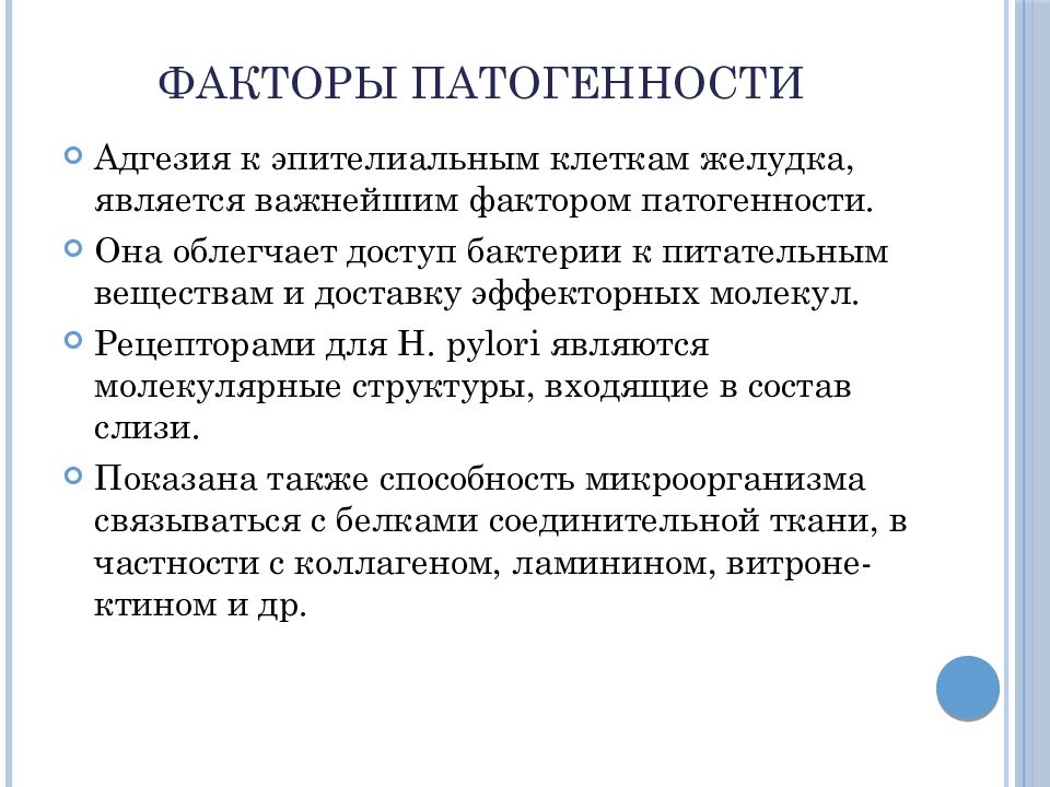 Адгезия к эпителиальным клеткам желудка, является важнейшим фактором патогенности. Она облегчает доступ бактерии к питательным веществам и доставку эффекторных молекул. Рецепторами для Н. pylori являются молекулярные структуры, входящие в состав слизи. Показана также способность микроорганизма связываться с белками соединительной ткани, в частности с коллагеном, ламинином, витроне-ктином и др.