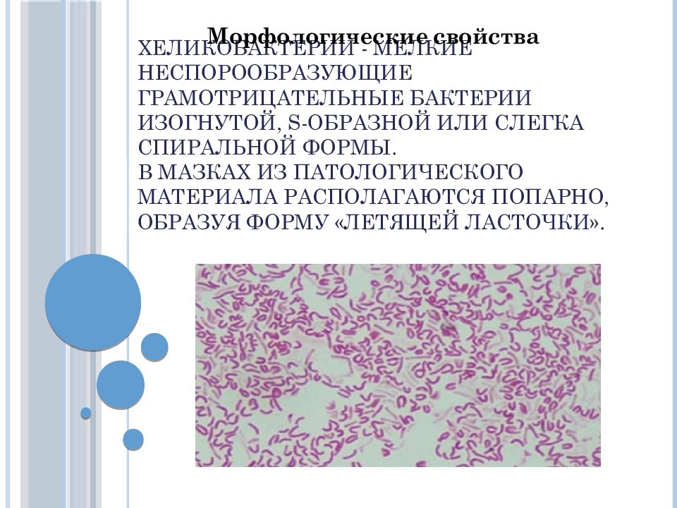 Слайд 6: Хеликобактерии - мелкие неспорообразующие грамотрицательные бактерии изогнутой, S-образной или слегка спиральной формы. В мазках из патологического материала располагаются попарно, образуя форму «летящей ласточки»