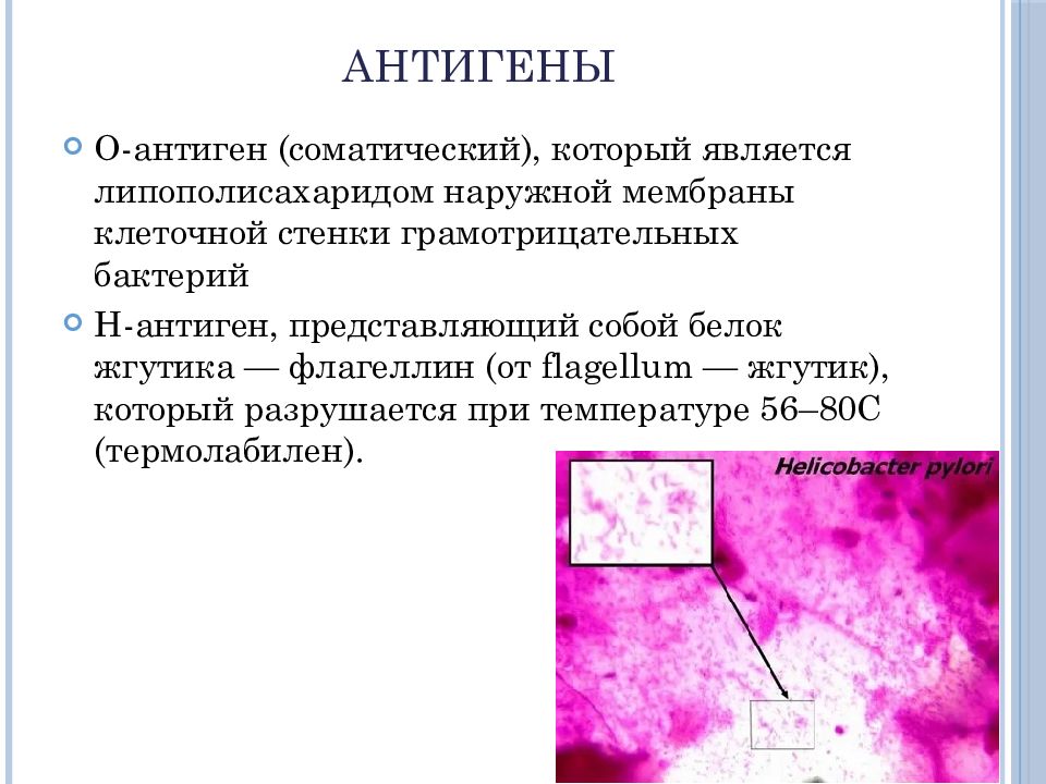 О-антиген (соматический), который является липополисахаридом наружной мембраны клеточной стенки грамотрицательных бактерий Н-антиген, представляющий собой белок жгутика — флагеллин (от flagellum — жгутик), который разрушается при температуре 56–80С (термолабилен).