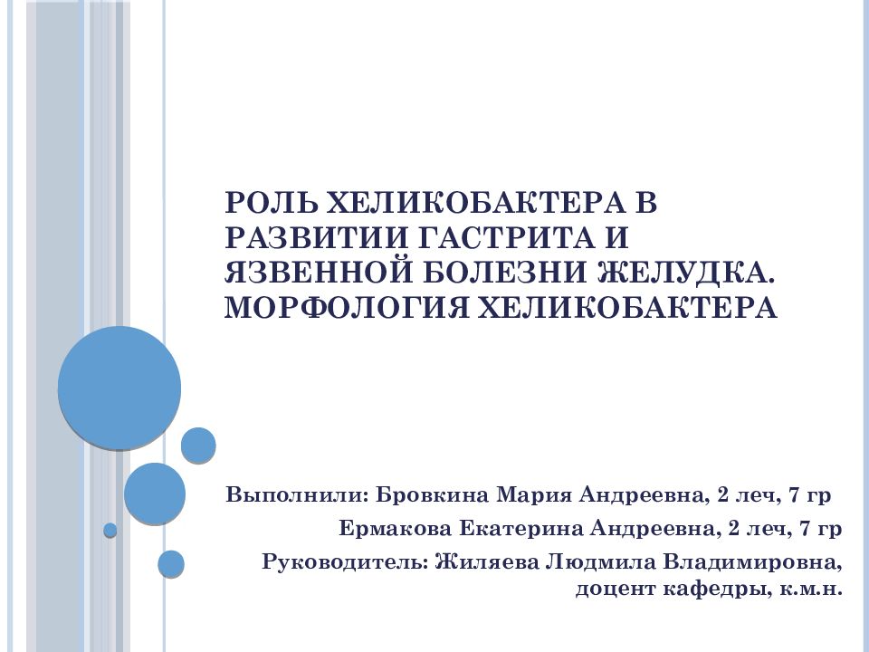 Первый слайд презентации: Роль хеликобактера в развитии гастрита и язвенной болезни желудка. Морфология хеликобактера