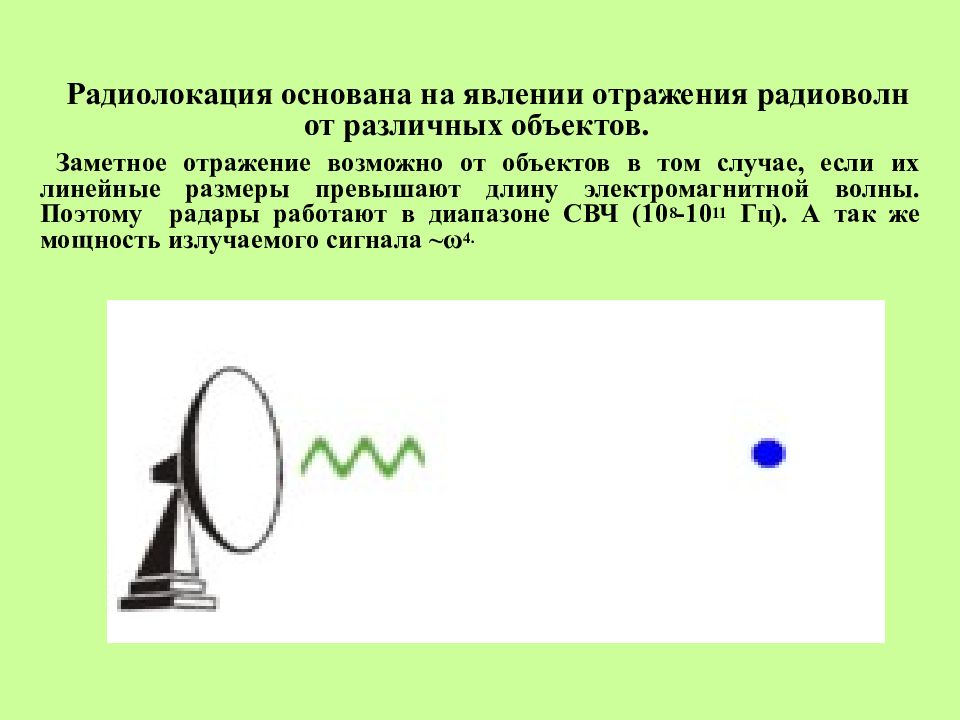 Радиолокация основана на явлении отражения радиоволн от различных объектов. Заметное отражение возможно от объектов в том случае, если их линейные размеры превышают длину электромагнитной волны. Поэтому радары работают в диапазоне СВЧ (10 8 -10 11 Гц). А так же мощность излучаемого сигнала ~ ω 4.