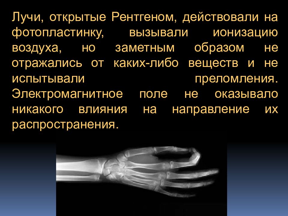 Лучи, открытые Рентгеном, действовали на фотопластинку, вызывали ионизацию воздуха, но заметным образом не отражались от каких-либо веществ и не испытывали преломления. Электромагнитное поле не оказывало никакого влияния на направление их распространения.