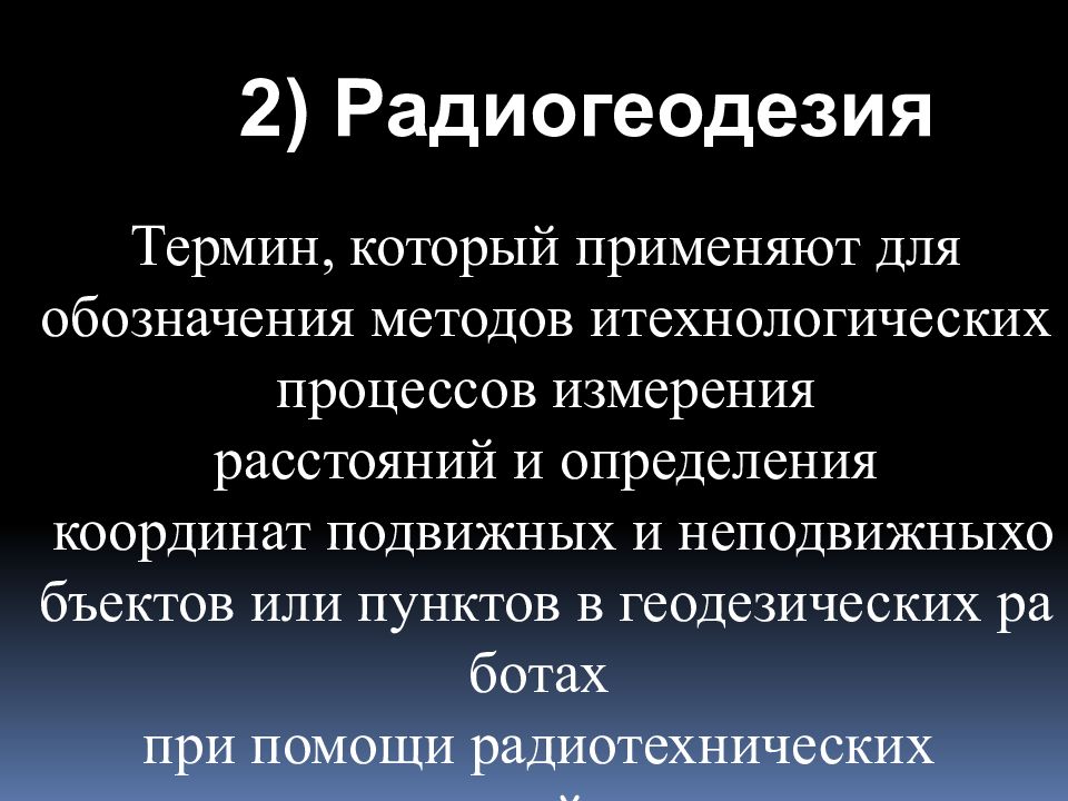 2) Радиогеодезия Термин, который применяют для обозначения методов итехнологических процессов измерения расстояний и определения координат подвижных и неподвижныхобъектов или пунктов в геодезических работах при помощи радиотехнических устройств
