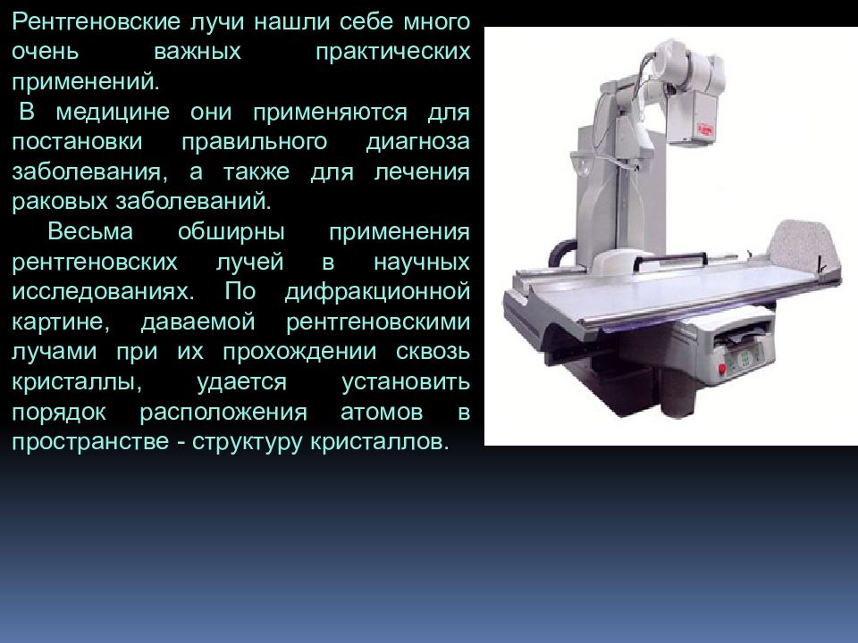 Рентгеновские лучи нашли себе много очень важных практических применений. В медицине они применяются для постановки правильного диагноза заболевания, а также для лечения раковых заболеваний. Весьма обширны применения рентгеновских лучей в научных исследованиях. По дифракционной картине, даваемой рентгеновскими лучами при их прохождении сквозь кристаллы, удается установить порядок расположения атомов в пространстве - структуру кристаллов.