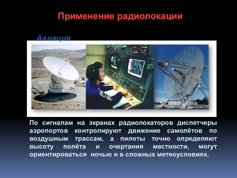 По сигналам на экранах радиолокаторов диспетчеры аэропортов контролируют движение самолётов по воздушным трассам, а пилоты точно определяют высоту полёта и очертания местности, могут ориентироваться ночью и в сложных метеоусловиях. Авиация Применение радиолокации