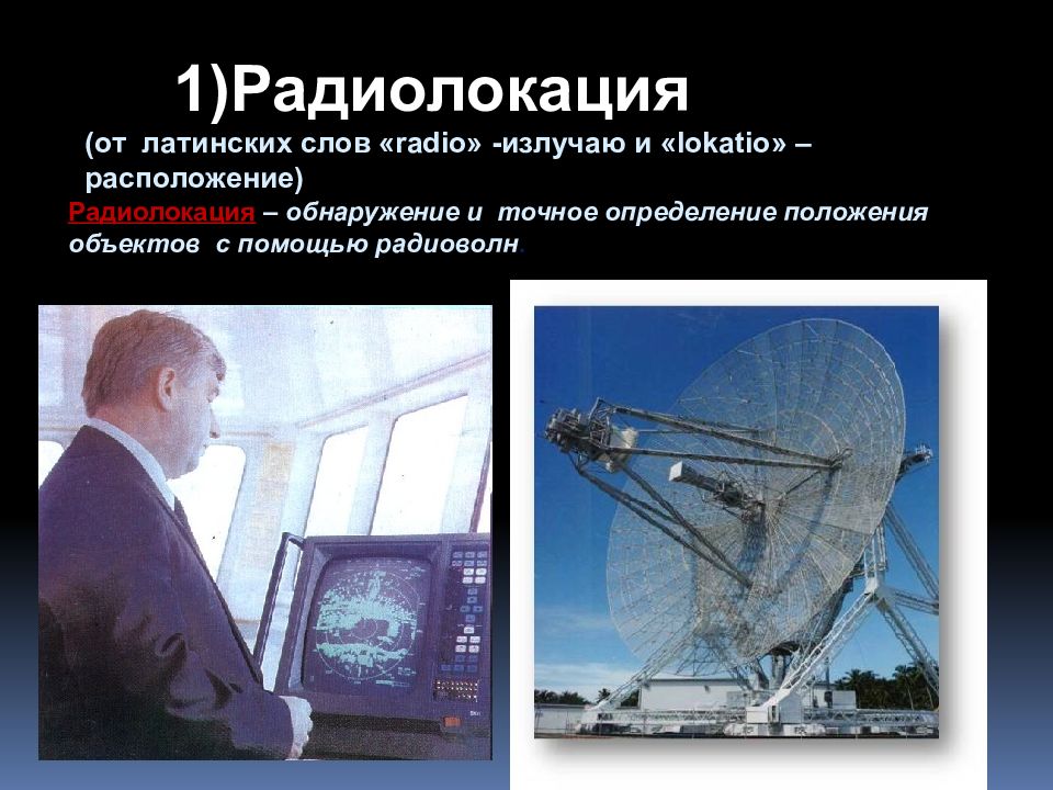 1)Радиолокация (от латинских слов « radio » -излучаю и « lokatio » – расположение) Радиолокация – обнаружение и точное определение положения объектов с помощью радиоволн.