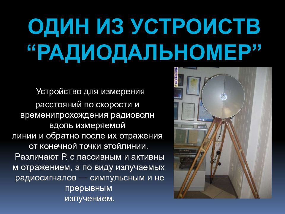 Один из устроиств “ Радиодальномер ” Устройство для измерения расстояний по скорости и временипрохождения радиоволн вдоль измеряемой линии и обратно после их отражения от конечной точки этойлинии. Различают Р. с пассивным и активным отражением, а по виду излучаемых радиосигналов — симпульсным и непрерывным излучением.