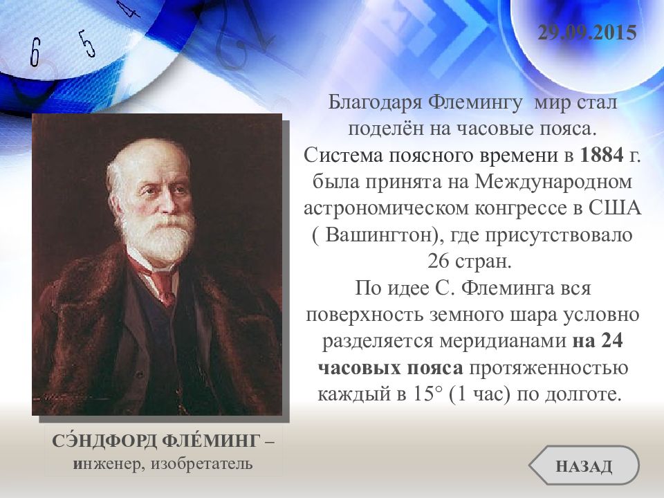 29.09.2015 Сэ́ндфорд Фле́минг – и нженер, изобретатель Благодаря Флемингу мир стал поделён на часовые пояса. С истема поясного времени в 1884 г. была принята на Международном астрономическом конгрессе в США ( Вашингтон), где присутствовало 26 стран. По идее С. Флеминга вся поверхность земного шара условно разделяется меридианами на 24 часовых пояса протяженностью каждый в 15° (1 час) по долготе. НАЗАД