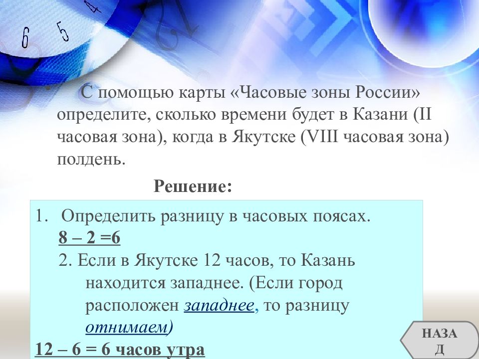 С помощью карты «Часовые зоны России» определите, сколько времени будет в Казани (II часовая зона), когда в Якутске ( V II I часовая зона) полдень. Определить разницу в часовых поясах. 8 – 2 = 6 2. Если в Якутске 12 часов, то Казань находится западнее. (Если город расположен западнее, то разницу отнимаем ) 12 – 6 = 6 часов утра Решение: Назад