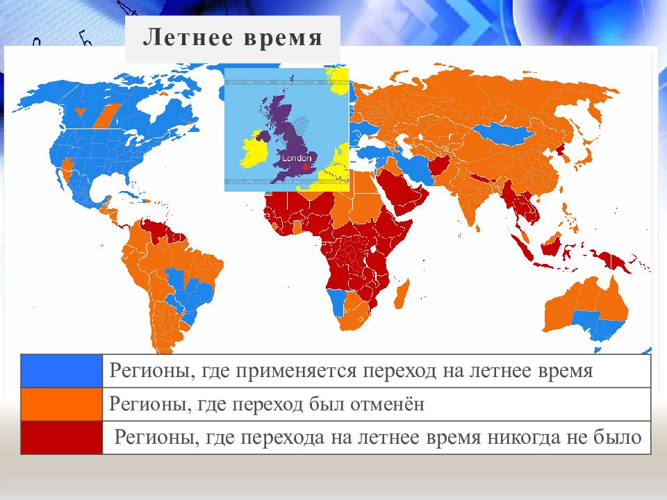 Регионы, где применяется переход на летнее время Регионы, где переход был отменён Регионы, где перехода на летнее время никогда не было Летнее время