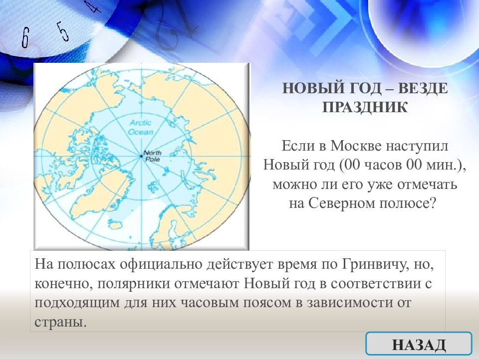 НОВЫЙ ГОД – ВЕЗДЕ ПРАЗДНИК Если в Москве наступил Новый год (00 часов 00 мин.), можно ли его уже отмечать на Северном полюсе? На полюсах официально действует время по Гринвичу, но, конечно, полярники отмечают Новый год в соответствии с подходящим для них часовым поясом в зависимости от страны. НАЗАД