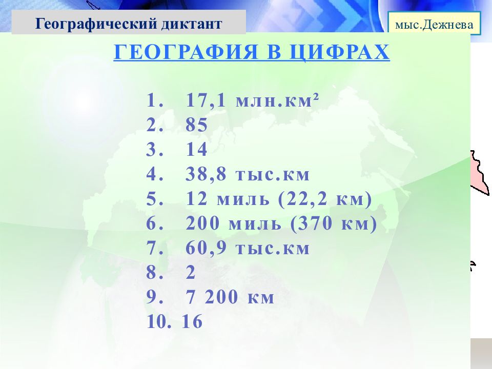 мыс.Флигели мыс.Дежнева Коса в Гданьском заливе г.Базардюзю мыс.Челюскин ГЕОГРАФИЯ В ЦИФРАХ 1. 17,1 млн.км² 2. 85 3. 14 4. 38,8 тыс.км 5. 12 миль (22,2 км) 6. 200 миль (370 км) 7. 60,9 тыс.км 8. 2 9. 7 200 км 16 Географический диктант