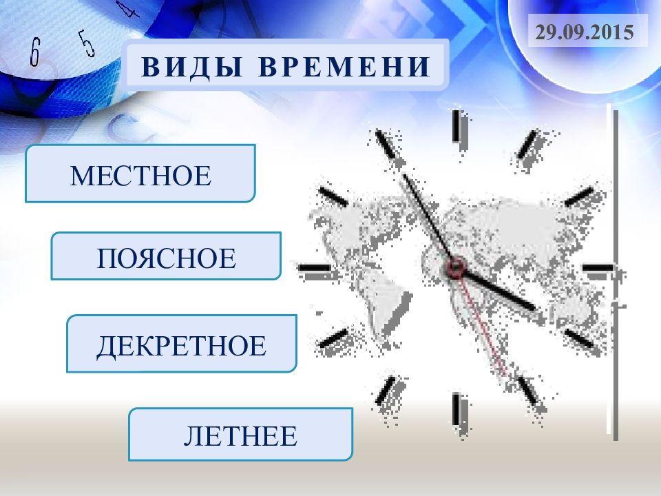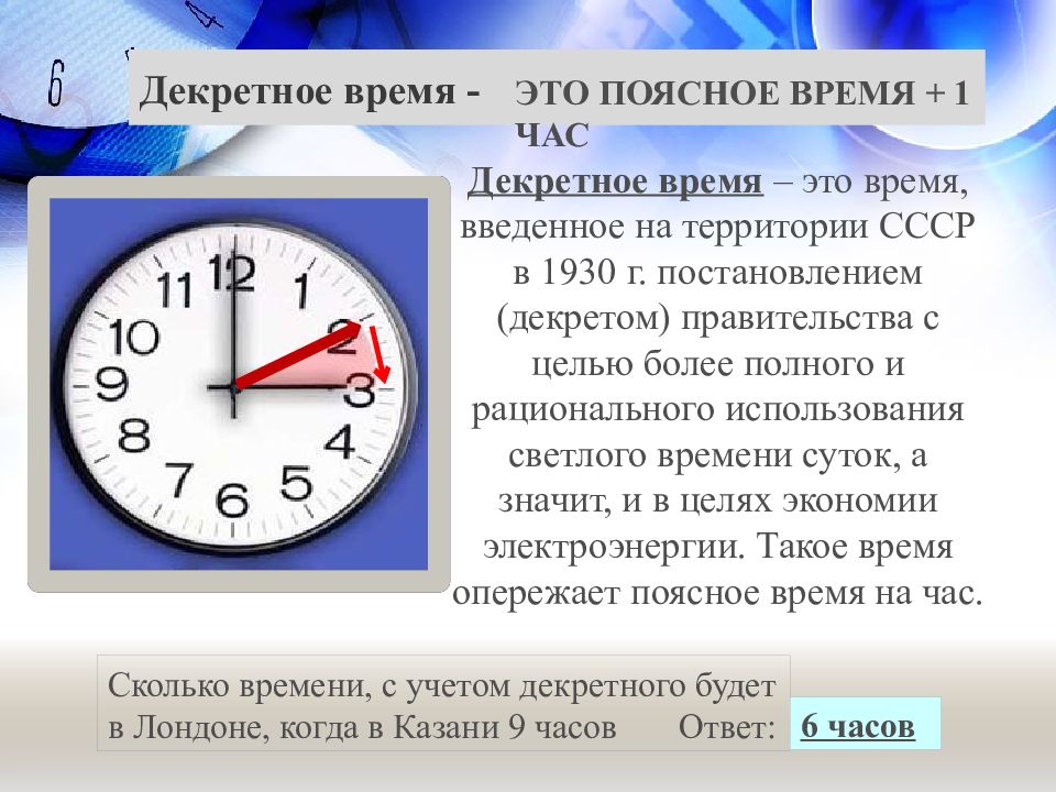 Декретное время – это время, введенное на территории СССР в 1930 г. постановлением (декретом) правительства с целью более полного и рационального использования светлого времени суток, а значит, и в целях экономии электроэнергии. Такое время опережает поясное время на час. Сколько времени, с учетом декретного будет в Лондоне, когда в Казани 9 часов Ответ: 6 часов это поясное время + 1 час
