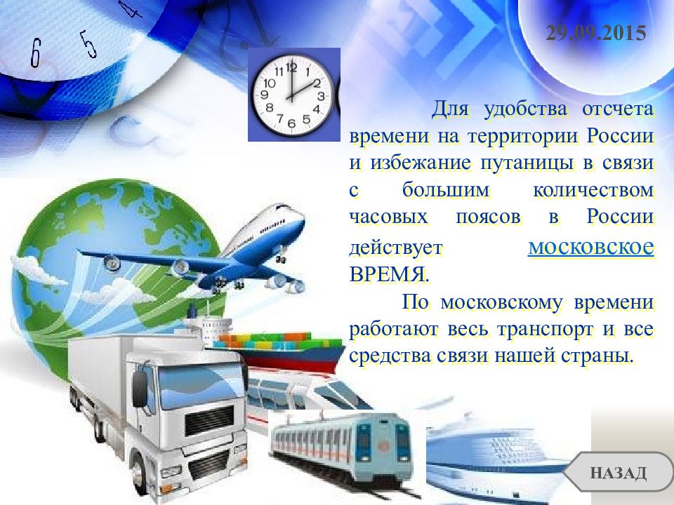 29.09.2015 Для удобства отсчета времени на территории России и избежание путаницы в связи с большим количеством часовых поясов в России действует московское время. По московскому времени работают весь транспорт и все средства связи нашей страны. НАЗАД