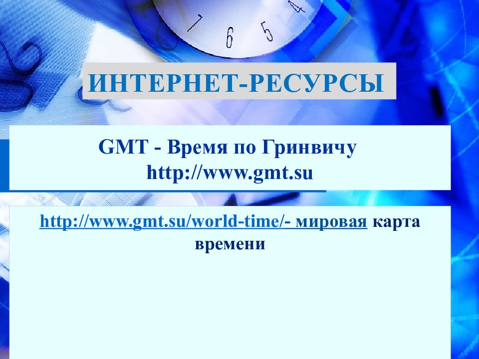 http://www.gmt.su/world-time/ - мировая карта времени ИНТЕРНЕТ-РЕСУРСЫ
