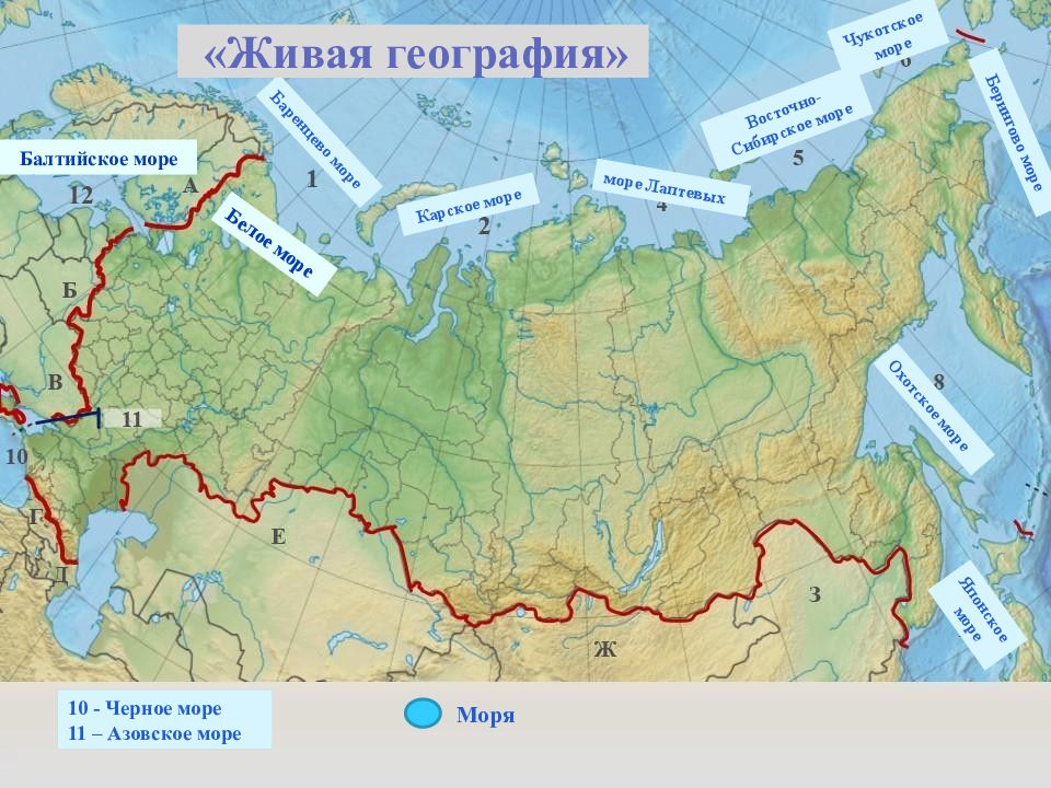 Баренцево море Карское море море Лаптевых Восточно-Сибирское море Чукотское море Берингово море Охотское море Японское море 10 - Черное море 11 – Азовское море Моря 12 Балтийское море 3 Белое море «Живая география»