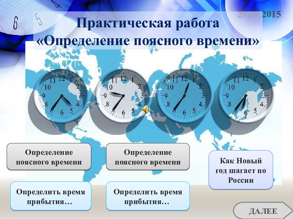 29.09.2015 Практическая работа «Определение поясного времени» далее Определить время прибытия… Как Новый год шагает по России Определить время прибытия… Определение поясного времени Определение поясного времени