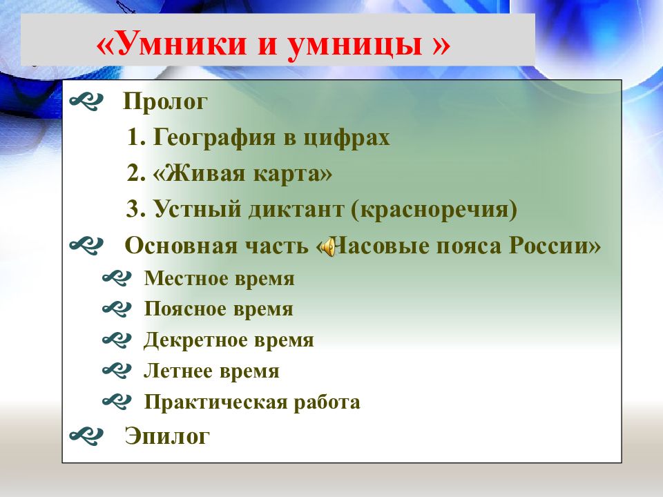 «Умники и умницы » Пролог 1. География в цифрах 2. «Живая карта» 3. Устный диктант (красноречия) Основная часть «Часовые пояса России» Местное время Поясное время Декретное время Летнее время Практическая работа Эпилог