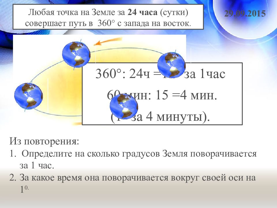 29.09.2015 Любая точка на Земле за 24 часа (сутки) совершает путь в 360° с запада на восток. 360°: 24ч =15° за 1час 60 мин: 15 =4 мин. (1° за 4 минуты). Из повторения: 1. Определите на сколько градусов Земля поворачивается за 1 час. За какое время она поворачивается вокруг своей оси на 1 0.