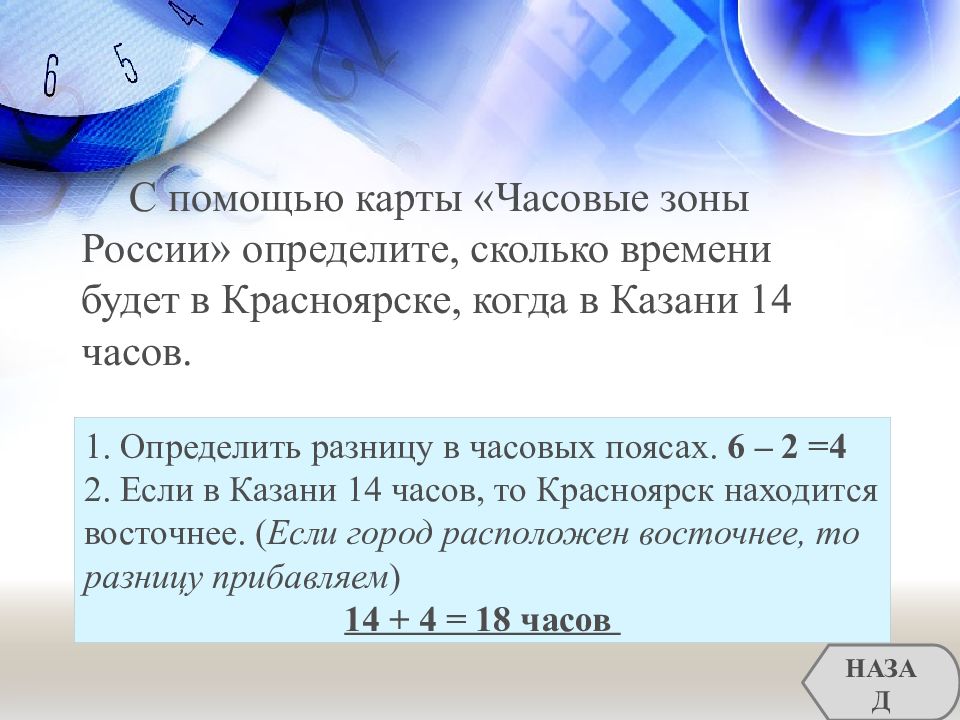 С помощью карты «Часовые зоны России» определите, сколько времени будет в Красноярске, когда в Казани 14 часов. 1. Определить разницу в часовых поясах. 6 – 2 = 4 2. Если в Казани 14 часов, то Красноярск находится восточнее. ( Если город расположен восточнее, то разницу прибавляем ) 14 + 4 = 1 8 часов Назад