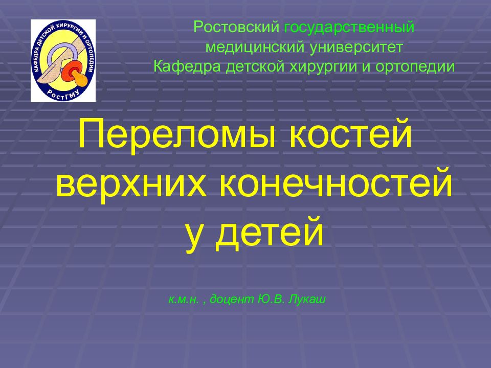 Переломы костей верхних конечностей у детей к.м.н., доцент Ю.В. Лукаш