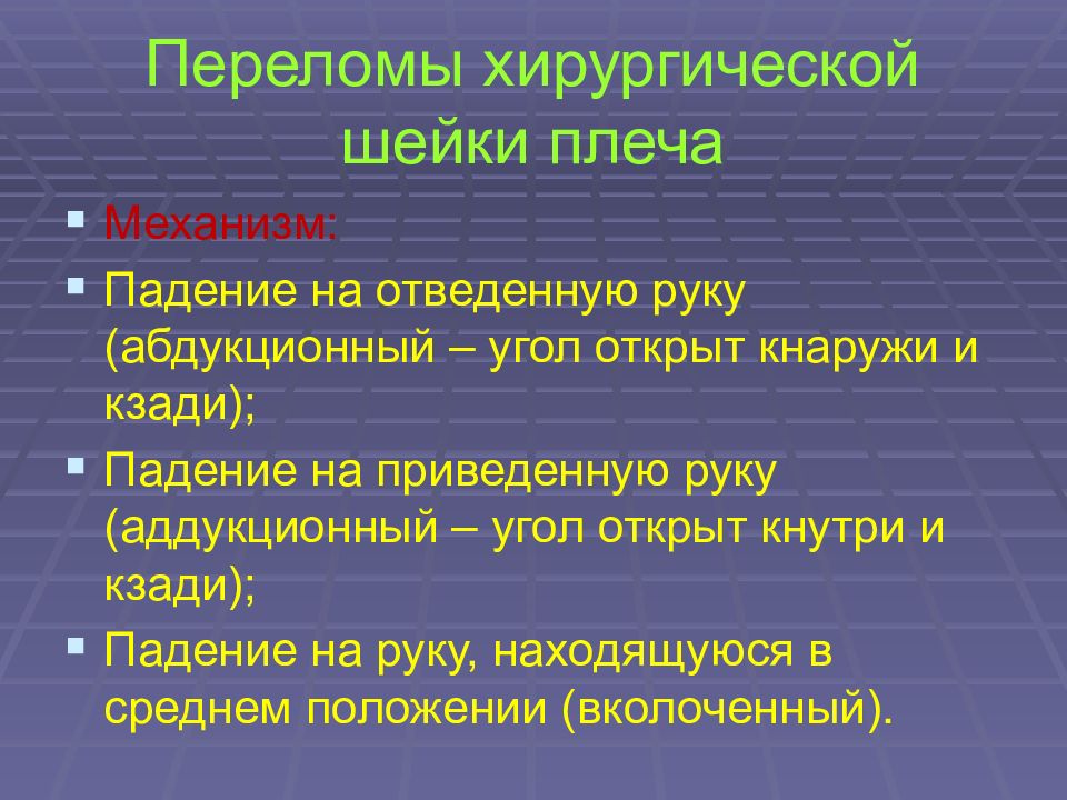 Механизм: Падение на отведенную руку ( абдукционный – угол открыт кнаружи и кзади); Падение на приведенную руку ( аддукционный – угол открыт кнутри и кзади); Падение на руку, находящуюся в среднем положении (вколоченный).