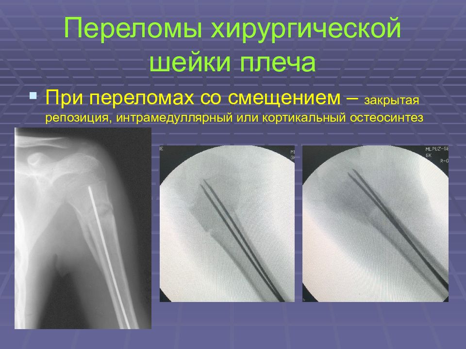 При переломах со смещением – закрытая репозиция, интрамедуллярный или кортикальный остеосинтез