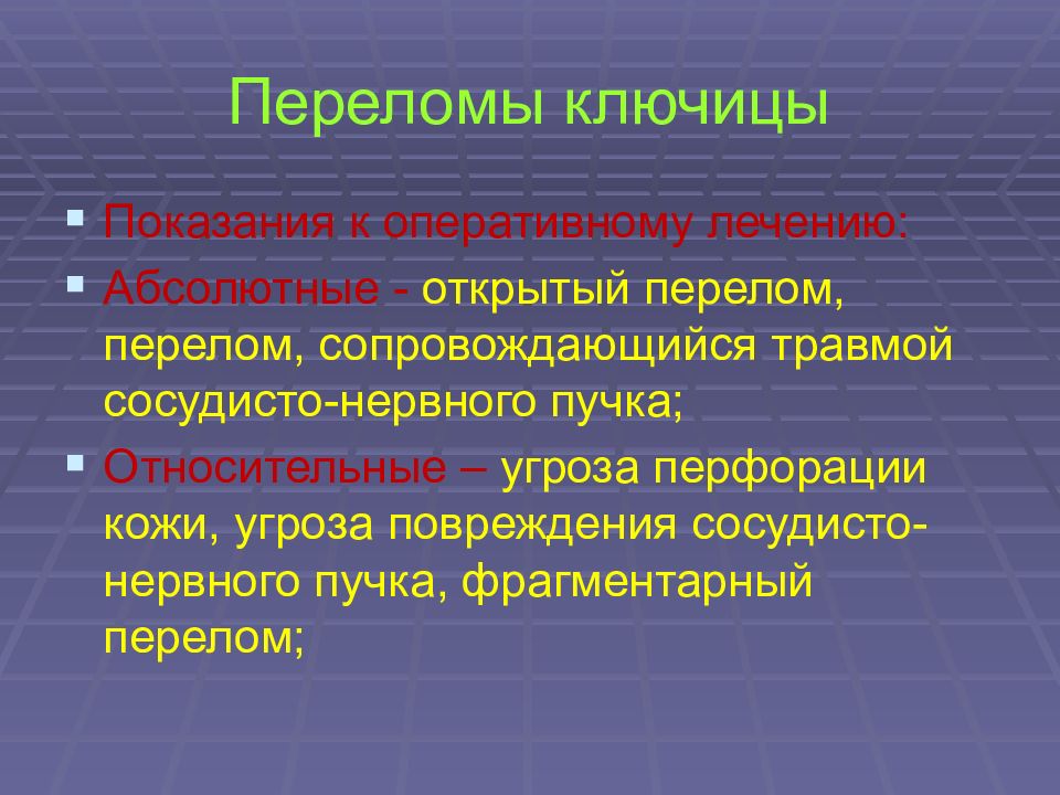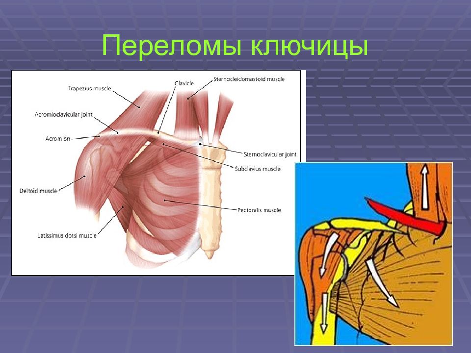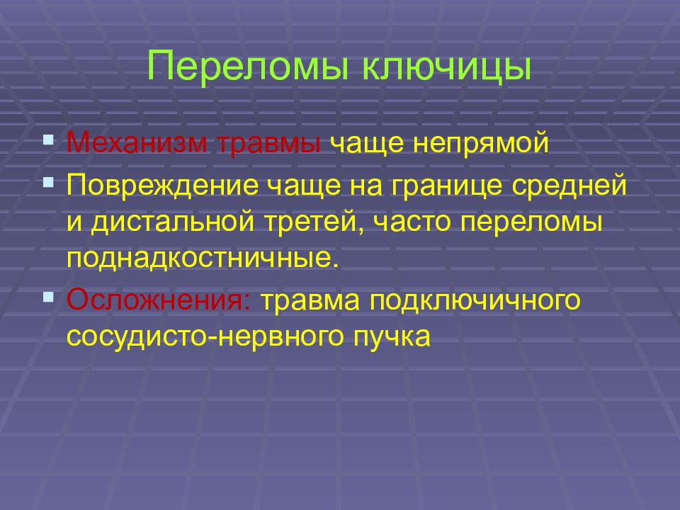 Механизм травмы чаще непрямой Повреждение чаще на границе средней и дистальной третей, часто переломы поднадкостничные. Осложнения: травма подключичного сосудисто-нервного пучка