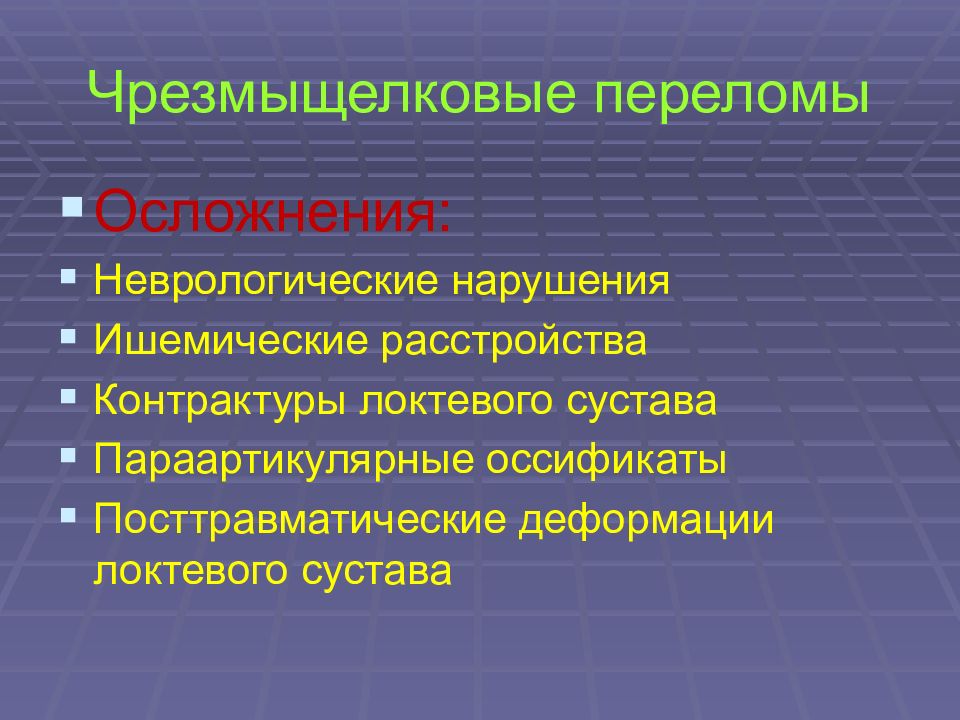 Осложнения: Неврологические нарушения Ишемические расстройства Контрактуры локтевого сустава Параартикулярные оссификаты Посттравматические деформации локтевого сустава