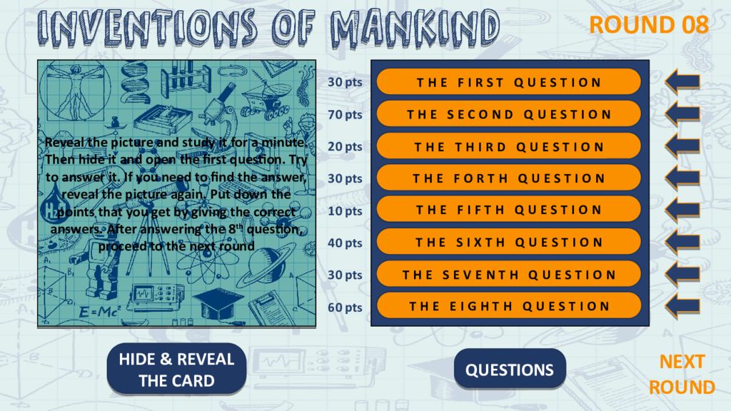 ROUND 11 10 pts 40 pts 20 pts 10 pts 50 pts 40 pts 30 pts 20 pts Reveal the picture and study it for a minute. Then hide it and open the first question. Try to answer it. If you need to find the answer, reveal the picture again. Put down the points that you get by giving the correct answers. After answering the 8 th question, proceed to the next round 1 2 3 4 5 6 7 8 Who invented the telescope? How many planets are there in the picture? What country was the telescope invented? How many telescopes are there in the picture? What magnification did the first telescope have? How many stars are there in the picture? What year was the telescope invented? How many legs does a telescope have? Questions The first question The SECOND question The THIRD question The FORTH question The fifth question The sixth question The seventh question The eighth question HIDE & REVEAL THE CARD NEXT ROUND