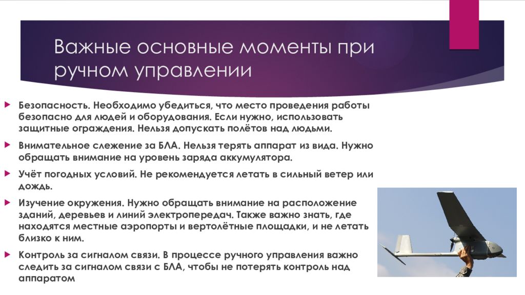 Безопасность. Необходимо убедиться, что место проведения работы безопасно для людей и оборудования. Если нужно, использовать защитные ограждения. Нельзя допускать полётов над людьми. Внимательное слежение за БЛА. Нельзя терять аппарат из вида. Нужно обращать внимание на уровень заряда аккумулятора. Учёт погодных условий. Не рекомендуется летать в сильный ветер или дождь. Изучение окружения. Нужно обращать внимание на расположение зданий, деревьев и линий электропередач. Также важно знать, где находятся местные аэропорты и вертолётные площадки, и не летать близко к ним. Контроль за сигналом связи. В процессе ручного управления важно следить за сигналом связи с БЛА, чтобы не потерять контроль над аппаратом