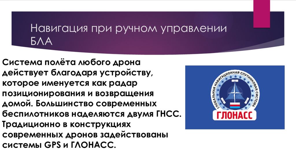 Система полёта любого дрона действует благодаря устройству, которое именуется как радар позиционирования и возвращения домой. Большинство современных беспилотников наделяются двумя ГНСС. Традиционно в конструкциях современных дронов задействованы системы GPS и ГЛОНАСС.