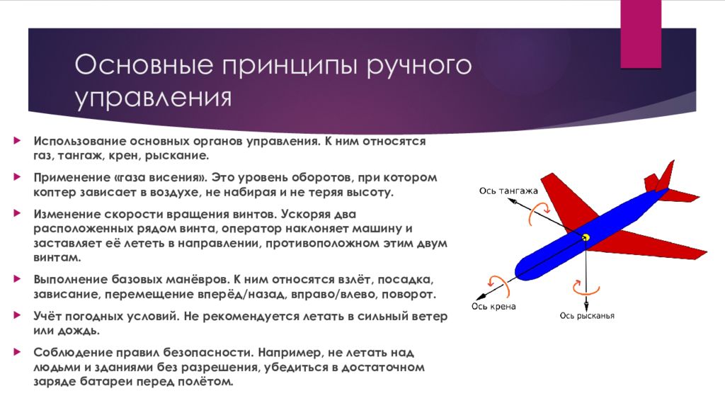 Использование основных органов управления. К ним относятся газ, тангаж, крен, рыскание. Применение «газа висения». Это уровень оборотов, при котором коптер зависает в воздухе, не набирая и не теряя высоту. Изменение скорости вращения винтов. Ускоряя два расположенных рядом винта, оператор наклоняет машину и заставляет её лететь в направлении, противоположном этим двум винтам. Выполнение базовых манёвров. К ним относятся взлёт, посадка, зависание, перемещение вперёд/назад, вправо/влево, поворот. Учёт погодных условий. Не рекомендуется летать в сильный ветер или дождь. Соблюдение правил безопасности. Например, не летать над людьми и зданиями без разрешения, убедиться в достаточном заряде батареи перед полётом.