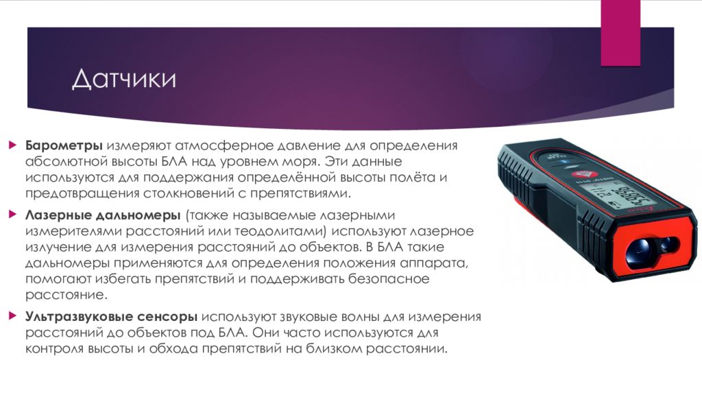 Барометры измеряют атмосферное давление для определения абсолютной высоты БЛА над уровнем моря. Эти данные используются для поддержания определённой высоты полёта и предотвращения столкновений с препятствиями. Лазерные дальномеры (также называемые лазерными измерителями расстояний или теодолитами) используют лазерное излучение для измерения расстояний до объектов. В БЛА такие дальномеры применяются для определения положения аппарата, помогают избегать препятствий и поддерживать безопасное расстояние. Ультразвуковые сенсоры используют звуковые волны для измерения расстояний до объектов под БЛА. Они часто используются для контроля высоты и обхода препятствий на близком расстоянии.