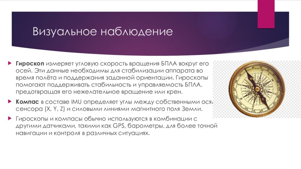 Гироскоп измеряет угловую скорость вращения БПЛА вокруг его осей. Эти данные необходимы для стабилизации аппарата во время полёта и поддержания заданной ориентации. Гироскопы помогают поддерживать стабильность и управляемость БПЛА, предотвращая его нежелательное вращение или крен. Компас в составе IMU определяет углы между собственными осями сенсора (X, Y, Z) и силовыми линиями магнитного поля Земли. Гироскопы и компасы обычно используются в комбинации с другими датчиками, такими как GPS, барометры, для более точной навигации и контроля в различных ситуациях.