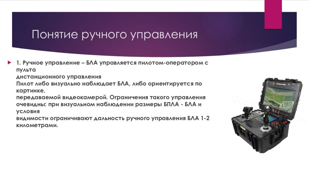 1. Ручное управление – БЛА управляется пилотом-оператором с пульта дистанционного управления Пилот либо визуально наблюдает БЛА, либо ориентируется по картинке, передаваемой видеокамерой. Ограничения такого управления очевидны: при визуальном наблюдении размеры БПЛА - БЛА и условия видимости ограничивают дальность ручного управления БЛА 1-2 километрами.