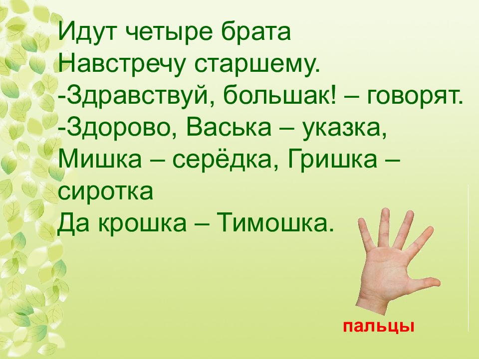 Идут четыре брата Навстречу старшему. -Здравствуй, большак! – говорят. -Здорово, Васька – указка, Мишка – серёдка, Гришка – сиротка Да крошка – Тимошка. пальцы