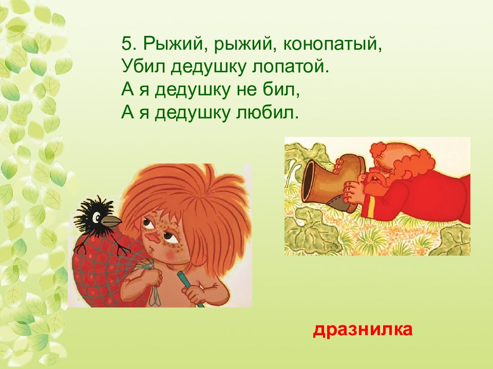 5. Рыжий, рыжий, конопатый, Убил дедушку лопатой. А я дедушку не бил, А я дедушку любил. дразнилка