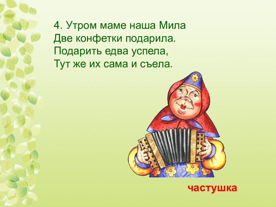4. Утром маме наша Мила Две конфетки подарила. Подарить едва успела, Тут же их сама и съела. частушка