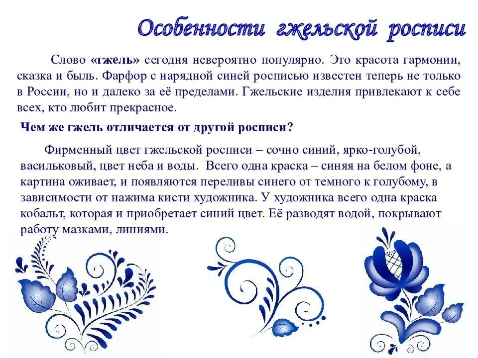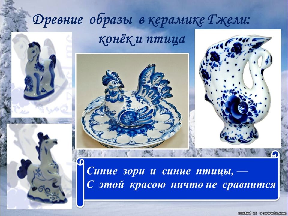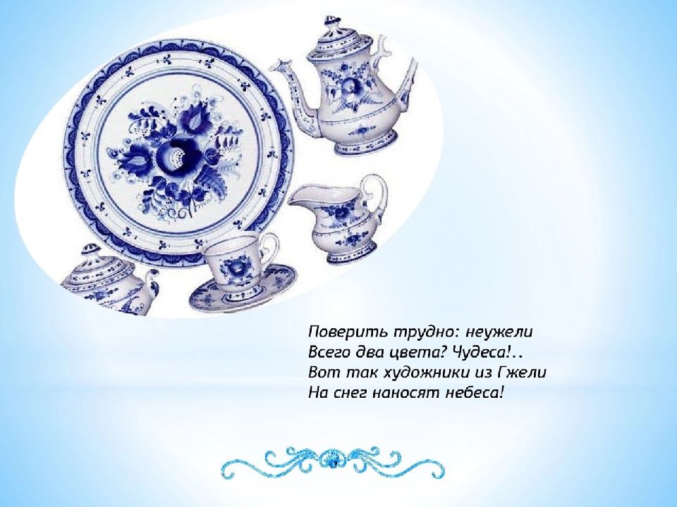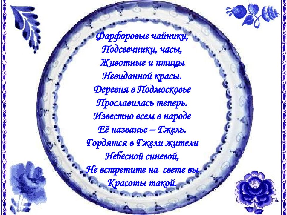 Фарфоровые чайники, Подсвечники, часы, Животные и птицы Невиданной красы. Деревня в Подмосковье Прославилась теперь. Известно всем в народе Её названье – Гжель. Гордятся в Гжели жители Небесной синевой, Не встретите на свете вы Красоты такой.