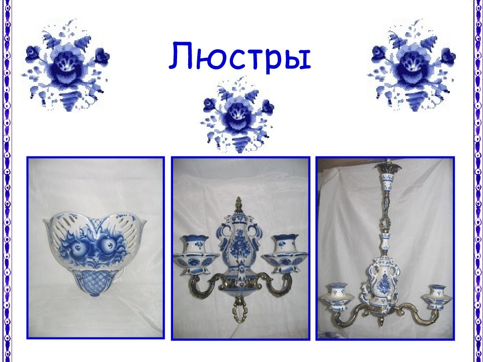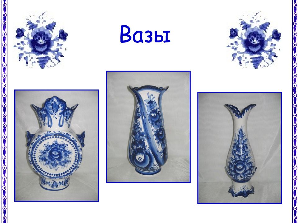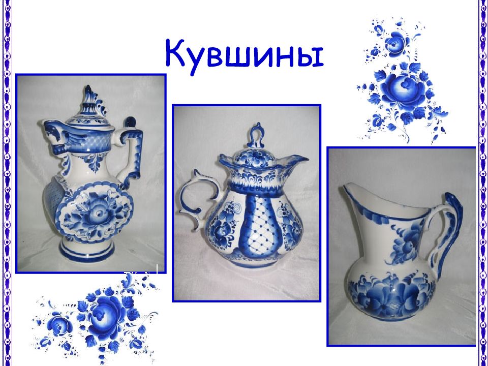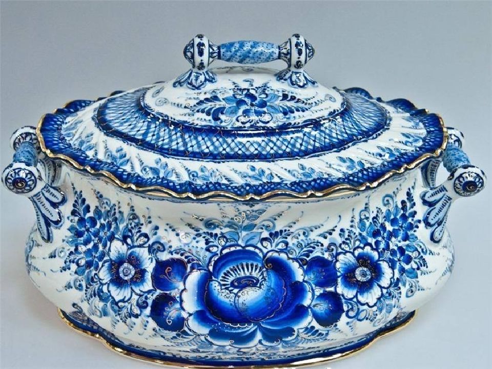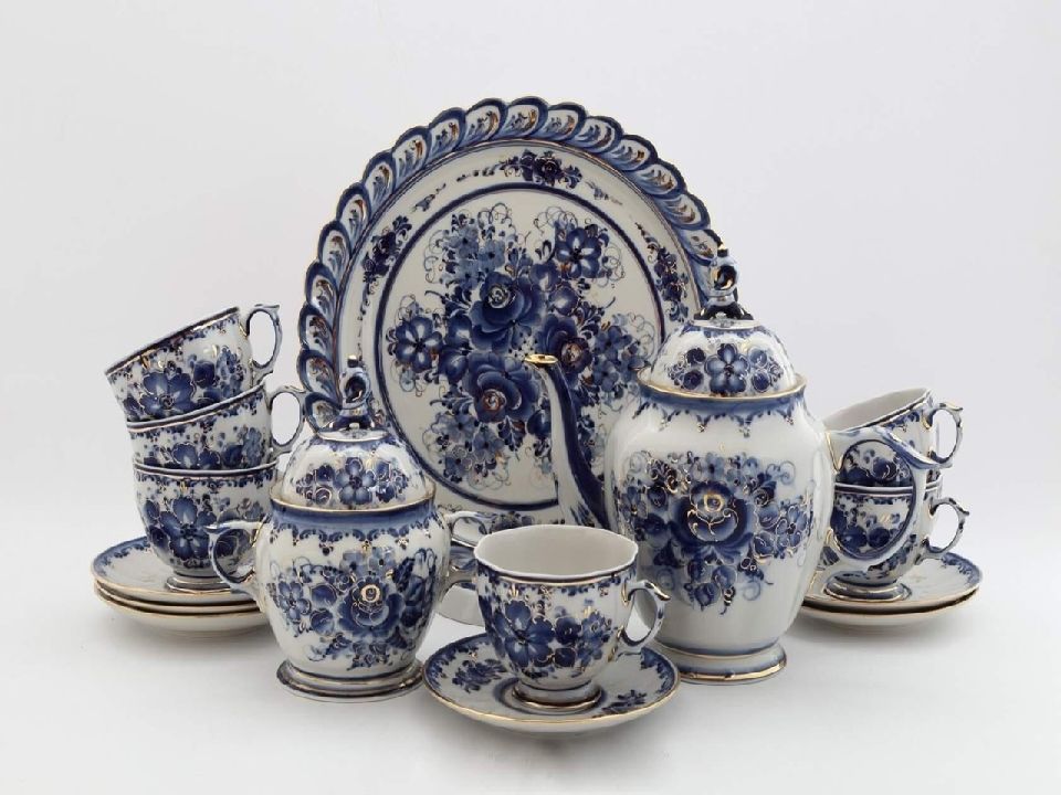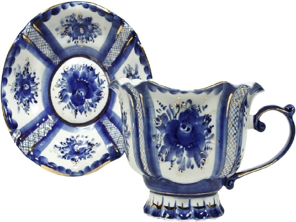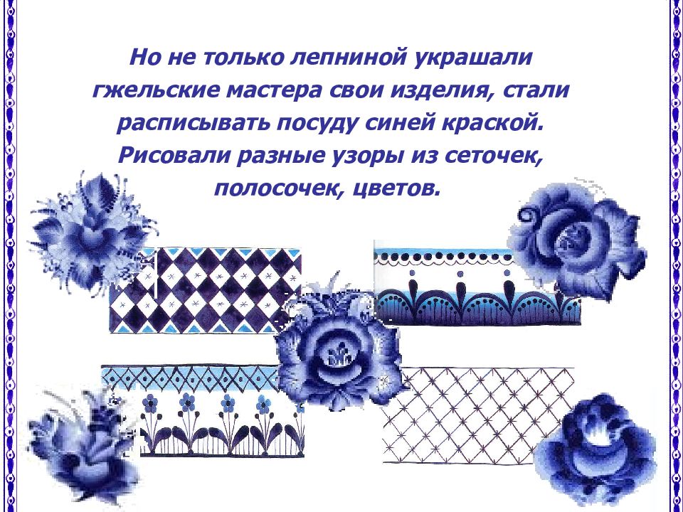 Но не только лепниной украшали гжельские мастера свои изделия, стали расписывать посуду синей краской. Рисовали разные узоры из сеточек, полосочек, цветов.