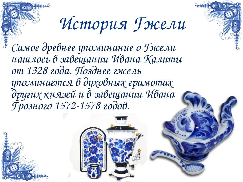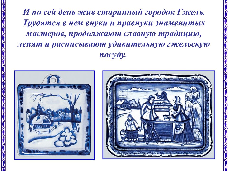 И по сей день жив старинный городок Гжель. Трудятся в нем внуки и правнуки знаменитых мастеров, продолжают славную традицию, лепят и расписывают удивительную гжельскую посуду.